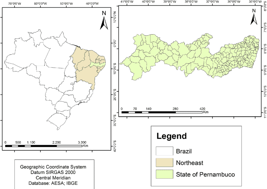 Map of the modern State of Pernambuco. Though they share the name, the Captaincy of Pernambuco occupied a much different area from the state. Please refer to the Hereditary Captaincies